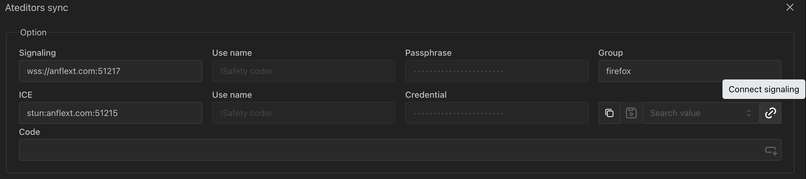 eyJpY2UiOnsidXJsIjoic3R1bjphbmZsZXh0LmNvbTo1MTIxNSJ9LCJsYWJlbCI6InRlc3QiLCJzaWduYWxpbmciOnsiZ3JvdXAiOiJmaXJlZm94IiwidXJsIjoid3NzOi8vYW5mbGV4dC5jb206NTEyMTcifSwic3NpciI6IjdCT09PWXNUN0VvTE4tY05VSUlZdTZUcFNOQ3ZWVFZtZ2dCSE5DeVY0Tjd6dE1VOXJ4TlJYeWl2LUJtZTlBMzg3WHljYUNSU1d0RWRKNXRBUlY3UFkxZkhEYlV3UW9sNVBLZXg0WHo0anZ4QnRxRGNmSlFDVEh2RnhDWmprdGc0bk9qWGhOdkxjN252cjIwdWtFeFBhWkFhVFhsYjFpVGlLV0RCekZZQzZJTXVHVTVQOXo0MVdaSF83SVZLRFZjWkJfalhDRjVzMmxIQnNDNEZRVUxLbjcyTDVGTmJjZlRGUmxhalFDc0o1eVBtM2pBSnVLTHAtVERLM0UyQmh3by1jUUN5UWd5ME1UdDIxN0YwWW16T3RmWEd4SlgxcC1GTW1CcmctcEFXbFp1ZnBnQld4c0hVUmZSeXAtNTZuMmN0VXl6Z2lrQkZRQ0dhQnUxc0ZEZnowaHVyd0EifQ粘贴以上 coder 到 ateditors 实时通信功能 option 的 code 字段,点击 Apply coder 按钮解码填充参数字段。